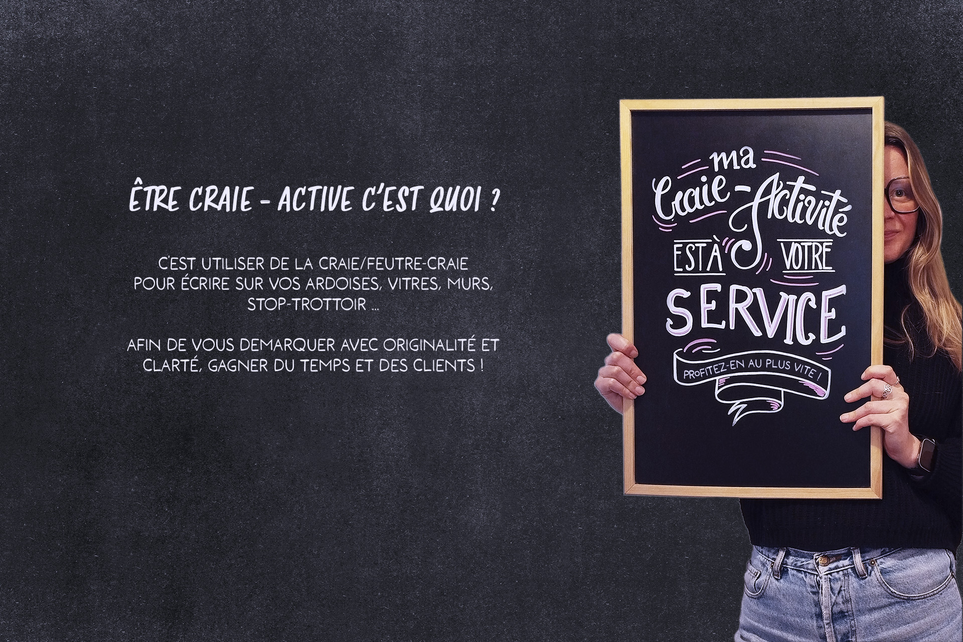 C’EST UTILISER DE LA CRAIE/FEUTRE-CRAIE POUR ÉCRIRE SUR VOS ARDOISES, VITRES, MURS, STOP-TROTTOIR ...AFIN DE VOUS DEMARQUER AVEC ORIGINALITÉ ET CLARTÉ, GAGNER DU TEMPS ET DES CLIENTS !